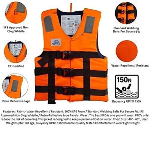 Water-repellent fabric, 100% EPE foam, secure webbing belts, IRS-approved whistle, reflective tape. Fits chest sizes 40″-60″, supports up to 120 kg+, 150N buoyancy. Durable, quality-tested, lightweight, and comfortable.